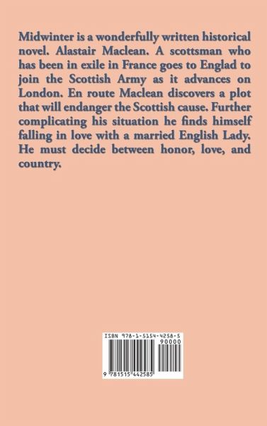 Midwinter is a wonderfully written historical novel. Alastair Maclean. A scottsman who has been in exile in France goes to Englad to join the Scottish Army as it advances on London. En route Maclean discovers a plot that will endanger the Scottish cause. Further complicating his situation he finds himself falling in love with a married English Lady. He must decide between honor, love, and country.