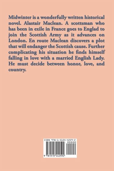 Midwinter is a wonderfully written historical novel. Alastair Maclean. A scottsman who has been in exile in France goes to Englad to join the Scottish Army as it advances on London. En route Maclean discovers a plot that will endanger the Scottish cause. Further complicating his situation he finds himself falling in love with a married English Lady. He must decide between honor, love, and country.