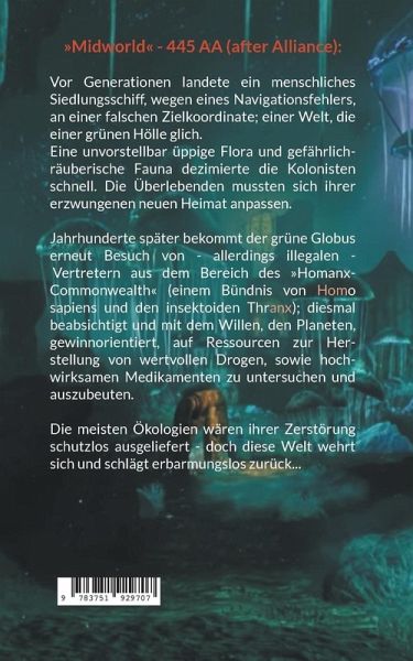 »Midworld« - 445 AA (after Alliance)...Vor Generationen landete ein menschliches Siedlungsschiff, wegen eines Navigationsfehlers, an einer falschen Zielkoordinate; einer Welt, die einer grünen Hölle glich.Eine unvorstellbar üppige Flora und gefährlich-räuberische Fauna dezimierte die Kolonisten schnell. Die Überlebenden mussten sich ihrer erzwungenen neuen Heimat anpassen.Jahrhunderte später bekommt der grüne Globus erneut Besuch von - allerdings illegalen - Vertretern aus dem Bereich des »Homanx-Commonwealth« (einem Bündnis von Homo sapiens und den insektoiden Thranx); diesmal beabsichtigt und mit dem Willen, den Planeten, gewinnorientiert, auf Ressourcen zur Herstellung von wertvollen Drogen, sowie hochwirksamen Medikamenten zu untersuchen und auszubeuten.Die meisten Ökologien wären ihrer Zerstörung schutzlos ausgeliefert - doch diese Welt wehrt sich und schlägt erbarmungslos zurück...