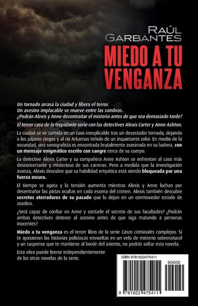 Un tornado arrasa la ciudad y libera el terror. Un asesino implacable se mueve entre las sombras. ¿Podrán Alexis y Anne desentrañar el misterio antes de que sea demasiado tarde? El tercer caso de la trepidante serie con las detectives Alexis Carter y Anne Ashton La ciudad se ve sumida en un caos inexplicable tras un devastador tornado, dejando a los pájaros ciegos y al río Arkansas teñido de un inquietante color. En medio de la oscuridad, una sonografista es encontrada brutalmente asesinada en su bañera, con un mensaje enigmático escrito con sangre cerca de su cuerpo. La detective Alexis Carter y su compañera Anne Ashton se enfrentan al caso más desconcertante y misterioso de sus carreras. Pero a medida que la investigación avanza, Alexis descubre que su habilidad empática está siendo bloqueada por una fuerza oscura. El tiempo se agota y la tensión aumenta mientras Alexis y Anne luchan por desentrañar las pistas ocultas en cada escena del crimen. Alexis también descubre secretos aterradores de su pasado que la dejan en un conmovedor estado de zozobra. ¿Será capaz de confiar en Anne y contarle el secreto de sus facultades? ¿Podrán ambas detectives detener al asesino antes de que siga matando a personas inocentes? Miedo a tu venganza es el tercer libro de la serie Casos criminales complejos. Si te apasionan las historias policíacas envueltas en un velo de misterio sobrenatural y un suspense que te mantiene al borde del asiento, no podrás soltar esta novela. Esta obra puede leerse independientemente de las otras novelas de la serie. Serie de las detectives Anne Ashton y Alexis Carter: - Precuela: Miedo en los ojos - Libro 1: Miedo en mis manos - Libro 2: Miedo en tu cadáver - Libro 3: Miedo a tu venganza - Libro 4: Donde nace el coraje - Libro 5: Tinieblas de culpa - Libro 6: Cortes del mismo acero