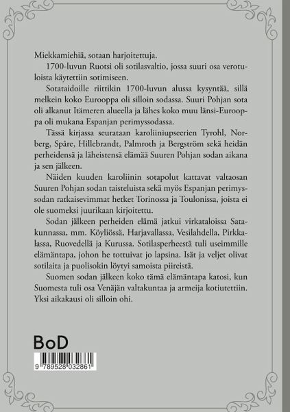 Kirjassa kerrotaan Suuresta Pohjan sodasta ja sen jälkeisestä ajasta kuuden karoliiniupseerin ja heidän perheidensä kautta. Heistä Henrik Spåre ja Johan Norberg olivat suomalaisia, Georg Johann Tyrohl ja Johann Michael Hillebrandt Liivinmaalta sekä Carl Palmroth ja Nils Bergström Ruotsista. Yhdessä näiden miesten sotapolut kattavat melkein kaikki Kaarle XII:n armeijan suuret taistelut alkaen Narvasta, Liivinmaalta ja Pultavasta, sen jälkeisistä Riian ja Tallinnan piirityksistä ja päättyen Suomeen Kostianvirralle ja Napuelle, sieltä Ruotsiin ja lopulta Norjan tuntureille. Tyrohl osallistui myös Espanjan perimyssodan suuriin taisteluihin Torinossa ja Toulonissa. Niistä ei ole aikaisemmin suomeksi kirjoitettu. Sen ajan yhteiskunnassa ja erityisesti sotilasuralla sukulaisverkosto sekä suhteet ylempään aatelistoon olivat tärkeitä. Tässä kirjassa nousevat esiin yhteydet varsinkin Rehbinder- ja von Liewen-sukuihin. Suuri Pohjan sota kesti yli 20 vuotta. Sodan loputtua syksyllä 1721 Porin rykmentti palasi laivoilla Norrtäljestä Turkuun. Kolme näistä miehistä oli silloin mukana. Henrik Spåre saapui kotiin vasta seuraavana vuonna 12 vuoden vankeudesta Siperiasta. Kaksi miehistä jäi Ruotsin multiin, mutta heidänkin lapsensa tulivat Suomeen. Sodan jälkeen alkoi uusi, erilainen elämä virkataloissa Satakunnassa: Köyliössä, Harjavallassa, Huittisissa, Vesilahdella, Pirkkalassa, Teiskossa, Ruovedellä ja Kurussa. Lasten aviopuolisot löytyivät aikanaan samoista piireistä ja niin sukulaisverkosto kasvoi. Parin sukupolven päästä näiden kuuden karoliinin perheet olivat jo yhtä suurta perhekuntaa. Sotilasperheestä ja nimismiesperheestä sen rinnalla tuli heille elämäntapa.