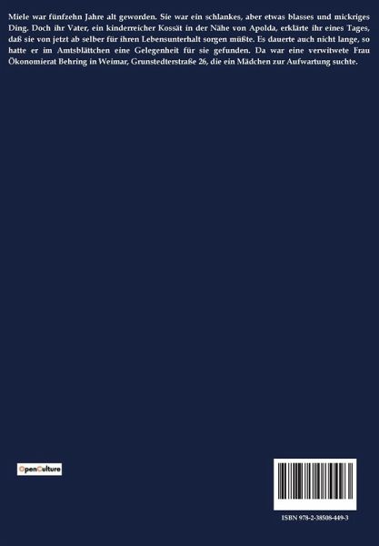 Miele war fünfzehn Jahre alt geworden. Sie war ein schlankes, aber etwas blasses und mickriges Ding. Doch ihr Vater, ein kinderreicher Kossät in der Nähe von Apolda, erklärte ihr eines Tages, daß sie von jetzt ab selber für ihren Lebensunterhalt sorgen müßte. Es dauerte auch nicht lange, so hatte er im Amtsblättchen eine Gelegenheit für sie gefunden. Da war eine verwitwete Frau Ökonomierat Behring in Weimar, Grunstedterstraße 26, die ein Mädchen zur Aufwartung suchte.