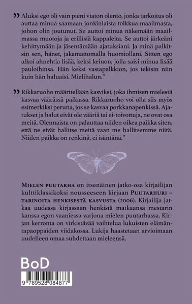 Mielen puutarha on itsenäinen jatko-osa kirjailijaa kulttiklassikoksi nousseeseen kirjaan Puutarhuri - tarinoita henkisestä kasvusta. Kirjailija jatkaa uudessa kirjassaan henkistä matkaansa mestarin kanssa egon vaaniessa varjona mielen puutarhassa. Kirjan kerronta on virkistävää vaihtelua lukuisten elämäntapaoppaiden viidakossa. Lukija haastetaan arvioimaan uudelleen omaa suhdettaan mieleensä.