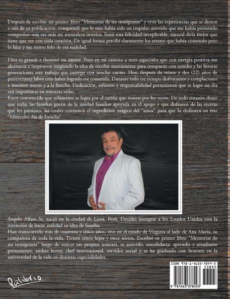 Después de escribir mi primer libro "Memorias de un inmigrante" y vivir las experiencias que se dieron a raíz de su publicación, comprendí que lo mío había sido un impulso atrevido que me había permitido comprobar una vez más mi naturaleza interior. Sentí una felicidad inexplicable, natural diría mejor que tiene que ver con toda creación. De igual forma percibí claramente los errores que había cometido pero lo hice y me siento feliz de esa realidad. Dios es grande e iluminó mi mente. Puso en mi camino a seres especiales que con energía positiva me alentaron e inspiraron surgiendo la idea de escribir nuevamente para compartir con ustedes y las futuras generaciones este trabajo que entrego con mucho cariño. Hoy, después de veinte y dos (22) años de perseverante labor creo haber logrado ese cometido. Durante todo ese tiempo disfrutamos y complacimos a nuestros nietos y a la familia. Dedicación, esfuerzo y responsabilidad permitieron que se logre un día tan importante en nuestras vidas. Estoy convencido que solamente se logra por el cariño que sientes por los tuyos. De todo corazón deseo que todas las familias gocen de la unidad familiar apoyada en el apego y que disfruten de las recetas que les presento, las cuales contienen el ingrediente mágico del "amor" para que lo disfruten en este "Miércoles día de Familia"
