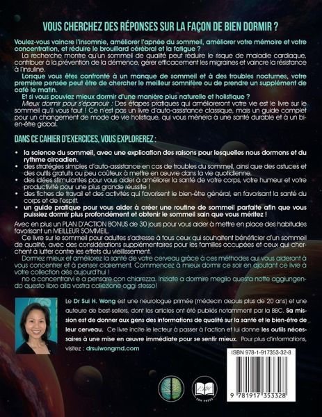 Vous cherchez des réponses sur la façon de bien dormir ?Voulez-vous vaincre l'insomnie, améliorer l'apnée du sommeil, améliorer votre mémoire et votre concentration, et réduire le brouillard cérébral et la fatigue ? La recherche montre qu'un sommeil de qualité peut réduire le risque de maladie cardiaque, contribuer à la prévention de la démence, gérer efficacement les migraines et vaincre la résistance à l'insuline. Lorsque vous êtes confronté à un manque de sommeil et à des troubles nocturnes, votre première pensée peut être de chercher le meilleur somnifère ou de prendre un supplément de café le matin. Et si vous pouviez mieux dormir d'une manière plus naturelle et holistique ? Mieux dormir pour s'épanouir : Des étapes pratiques qui amélioreront votre vie est le livre sur le sommeil qu'il vous faut ! Ce n'est pas un livre d'auto-assistance classique, mais un guide complet pour un changement de mode de vie holistique, qui vous mènera à une santé durable et à un bien-être global. Dans ce cahier d'exercices, vous explorerez :la science du sommeil, avec une explication des raisons pour lesquelles nous dormons et du rythme circadien. des stratégies simples d'auto-assistance en cas de troubles du sommeil, ainsi que des astuces et des outils gratuits ou peu coûteux à mettre en uvre dans la vie quotidienne. des idées stimulantes pour vous aider à améliorer la santé de votre corps, votre humeur et votre productivité pour une plus grande réussite ! des fiches de travail et des activités qui favorisent le bien-être général, en favorisant la santé du corps et de l'esprit. un guide pratique pour vous aider à créer une routine de sommeil parfaite afin que vous puissiez dormir plus profondément et obtenir le sommeil sain que vous méritez ! Avec en plus un PLAN D'ACTION BONUS de 30 jours pour vous aider à mettre en place des habitudes favorisant un MEILLEUR SOMMEIL. Dormez mieux et améliorez la santé de votre cerveau grâce à ces méthodes qui vous aideront à vous concentrer et à penser clairement. Commencez à mieux dormir ce soir en ajoutant ce livre à votre collection dès aujourd'hui !