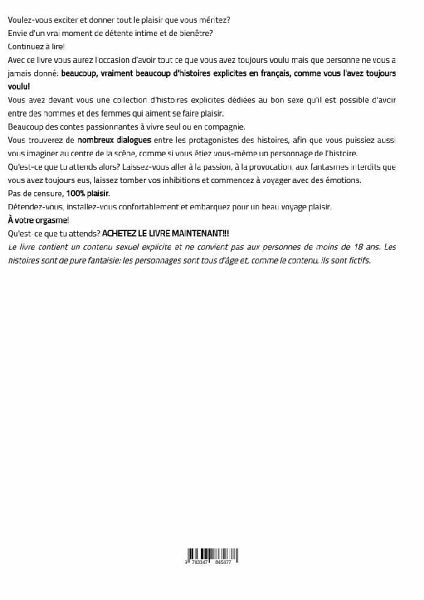 Voulez-vous exciter et donner tout le plaisir que vous méritez?Envie d'un vrai moment de détente intime et de bienêtre?Continuez à lire!Avec ce livre vous aurez l'occasion d'avoir tout ce que vous avez toujours voulu mais que personne ne vous a jamais donné: beaucoup, vraiment beaucoup d'histoires explicites en français, comme vous l'avez toujours voulu!Vous avez devant vous une collection d'histoires explicites dédiées au bon sexe qu'il est possible d'avoir entre des hommes et des femmes qui aiment se faire plaisir. Beaucoup des contes passionnantes à vivre seul ou en compagnie.Vous trouverez de nombreux dialogues entre les protagonistes des histoires, afin que vous puissiez aussi vous imaginer au centre de la scène, comme si vous étiez vous-même un personnage de l'histoire.Qu'est-ce que tu attends alors? Laissez-vous aller à la passion, à la provocation, aux fantasmes interdits que vous avez toujours eus, laissez tomber vos inhibitions et commencez à voyager avec des émotions.Pas de censure, seulement beaucoup de plaisir.Détendez-vous, installez-vous confortablement et embarquez pour un beau voyage plaisir.À votre orgasme!