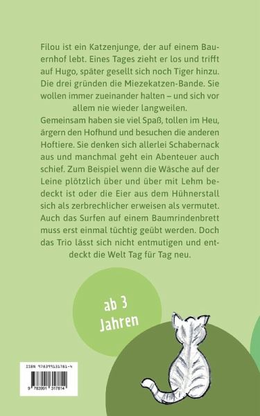 Filou ist ein Katzenjunge, der auf einem Bauernhof lebt. Eines Tages zieht er los und trifft auf Hugo, später gesellt sich noch Tiger hinzu. Die drei gründen die Miezekatzen-Bande. Sie wollen immer zueinander halten - und sich vor allem nie wieder langweilen.Gemeinsam haben sie viel Spaß, tollen im Heu, ärgern den Hofhund und besuchen die anderen Hoftiere. Sie denken sich allerlei Schabernack aus und manchmal geht ein Abenteuer auch schief. Zum Beispiel wenn die Wäsche auf der Leine plötzlich über und über mit Lehm bedeckt ist oder die Eier aus dem Hühnerstall sich als zerbrechlicher erweisen als vermutet. Auch das Surfen auf einem Baumrindenbrett muss erst einmal tüchtig geübt werden. Doch das Trio lässt sich nicht entmutigen und entdeckt die Welt Tag für Tag neu.