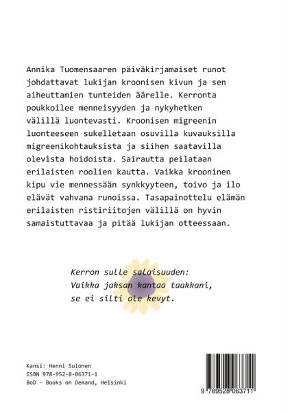 Tämän esikoisteoksen päiväkirjamaiset runot johdattavat lukijan kroonisen kivun ja sen aiheuttamien tunteiden äärelle. Kerronta poukkoilee menneisyyden ja nykyhetken välillä luontevasti. Kroonisen migreenin luonteeseen sukelletaan osuvilla kuvauksilla migreenikohtauksista ja siihen saatavilla olevista hoidoista. Sairautta peilataan erilaisten roolien kautta. Vaikka krooninen kipu vie mennessään synkkyyteen, toivo ja ilo elävät vahvana runoissa. Tasapainottelu elämän erilaisten ristiriitojen välillä on hyvin samaistuttavaa ja pitää lukijan otteessaan.