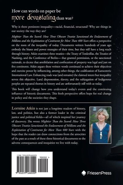 How can words on paper be more devastating than war? Why is there persistent inequality-racial, financial, structural? Why are things in our society the way they are? Mightier Than the Sword: How Three Obscure Treaties Sanctioned the Enslavement of Millions and the Exploitation of Continents for More Than 400 Years offers a perspective on the roots of the inequality of today. Documents written hundreds of years ago embody the biases and power strategies of their time, but they still have a long reach through history. Atkin examines three treaties-the Treaty of Tordesillas, the Treaties of Nanking, and the Conference of Berlin- that granted permission, or the sanctioned rationale, to decree that annihilation and confiscation of property was legal and just on five continents. Atkin argues these written words continued to achieve their objectives and exercise power by influencing, among other things, the codification of Eurocentric International Law. Enhancing trade was (and remains) the claimed intent but inequality serves this objective. Land dispossession, slavery, and the subjugation of Indigenous peoples are repeated themes in history and are unfortunately still with us today. This book will change how you understand today's events and the continuing influence of historic documents. This fresh perspective offers hope for real change in policy and the societies they shape.