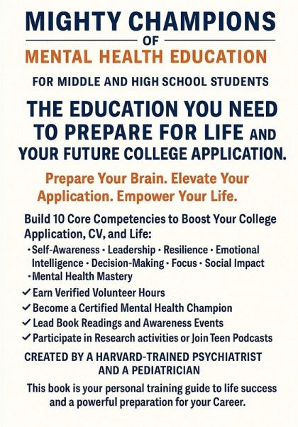 Mighty Champions of Mental Health EducationA Science-Backed Mental Health & Leadership Program for Middle & High School Students Give your teen the ultimate advantage-emotional strength, confidence, leadership skills, and real mental-health tools designed by a Harvard-trained psychiatrist and a pediatrician. Students today face unprecedented stress. This book gives them the skills to rise above it-from managing emotions to building resilience and preparing for a strong future.A Complete Mental Health Training System for Ages 10-18 This book teaches 10 essential competencies that improve emotional intelligence, academic success, and personal growth: ¿ Self-Awareness ¿ Self-Management ¿ Social Awareness ¿ Relationship Skills ¿ Responsible Decision-Making ¿ Problem Solving ¿ CBT Techniques ¿ Positive Psychology ¿ Mindfulness ¿ Resilience ¿ Bonus: Metacognition Each chapter includes real-life examples, activities, quizzes, and reflection questions that help students practice and master these skills in daily life.Prepare for Life-and College Students can: Earn verified community-service hours Become Certified Mental Health Champions Lead school awareness activities Participate in youth podcasts, research, and community events Strengthen resumes, leadership portfolios, and college applications This program is used in schools and youth organizations worldwide-and has already helped thousands of teens build stronger, healthier minds.Created by Mental Health Experts Written by: ¿¿¿¿ A Harvard-trained psychiatrist ¿¿¿¿ A pediatrician with 40+ years of experience Grounded in neuroscience and psychology, this book makes mental health practical, accessible, and empowering for every teen.Perfect for: ¿ Students ¿ Parents ¿ School counselors & SEL programs ¿ Homeschool families ¿ Youth groups and clubsHelp your teen become confident, resilient, and ready for life. Give them the tools to become a Mighty Champion of Mental Health.