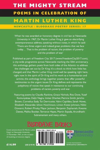 When he was awarded an honorary degree in civil law at Newcastle University in 1967, Dr Martin Luther King gave an electrifying extemporaneous address, speaking without notes, in which he said: 'There are three urgent and indeed great problems that we face today...That is the problem of racism, the problem of poverty and the problem of war.' As part of a fifty year anniversary and celebration, this anthology gathers poets from both sides of the Atlantic to address the challenges set out by Dr King. It's a shock to think how little has changed, and that Martin Luther King could well be speaking right here, right now. In the spirit of Dr King and his work as a humanitarian and activist, this anthology brings together poems that offer powerful testimonies to the urgent issues Dr King defines and represents the polyphony of voices that speak in resistance to our continuing problems of racism, poverty and war. Featuring poems by Claudia Rankine, Grace Nichols, Yusef Komunyakaa, Moniza Alvi, Rita Dove, Daljit Nagra, Imtiaz Dharker, Fred D'Aguiar, Oliver de la Paz, Rowan Ricardo Phillips, John Agard, Patricia Smith, Jericho Brown, Toi Derricotte, Vahni Capildeo, Carl Phillips, Sarah Howe, Elizabeth Alexander, Ishion Hutchinson, Linton Kwesi Johnson, Marilyn Nelson, Mimi Khalvati, Nikki Giovanni, Robert Pinsky, Bernardine Evaristo, Vidyan Ravinthiran, Major Jackson, Tim Seibles, Choman Hardi, Benjamin Zephaniah, Shazea Quraishi, E. Ethelbert Miller, Sandeep Parmar, Malika Booker, Roger Robinson, Rigoberto Gonzalez, Rae Paris, Kendel Hippolyte, Amali Rodrigo, Zaffar Kunial, Rishi Dastidar, Raymond Antrobus, Mai Der Vang, Martin Espada, Inua Ellams, Arundhathi Subramaniam, Gregory Pardlo, Edward Doegar, Degna Stone, MacDonald Dixon, Ada Limon, Philip Metres, Nick Makoha, Nathalie Handal, Lauren K Alleyne, Kevin Bowen, Bashabi Fraser, Satchid Anandan.