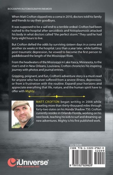 When Matt Crofton slipped into a coma in 2010, doctors told his family and friends to say their goodbyes. It was supposed to be a sad end to a terrible ordeal: Crofton had been rushed to the hospital after sarcoidosis and histoplasmosis attacked his body in what doctors called "the perfect storm." They said he had forty-eight hours to live. But Crofton defied the odds by surviving sixteen days in a coma and another six weeks in the hospital. Less than a year later, while battling post-traumatic depression, he vowed to become the first person to paddleboard the length of the Mississippi River. From the headwaters of the Mississippi in Lake Itasca, Minnesota, to the river's end in New Orleans, Louisiana, Crofton chronicles his inspiring journey with photos and journal entries. Gripping, poignant, and fun, Crofton's adventure story is a must-read for anyone who has ever suffered from a severe illness, depression, or from a frustration with the routine. Expand your horizons and appreciate everything that life, nature, and the human spirit have to offer with Mighty.