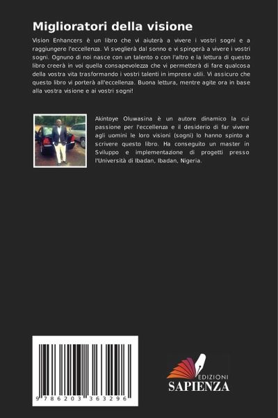 Vision Enhancers è un libro che vi aiuterà a vivere i vostri sogni e a raggiungere l'eccellenza. Vi sveglierà dal sonno e vi spingerà a vivere i vostri sogni. Ognuno di noi nasce con un talento o con l'altro e la lettura di questo libro creerà in voi quella consapevolezza che vi permetterà di fare qualcosa della vostra vita trasformando i vostri talenti in imprese utili. Vi assicuro che questo libro vi porterà all'eccellenza. Buona lettura, mentre agite ora in base alla vostra visione e ai vostri sogni!