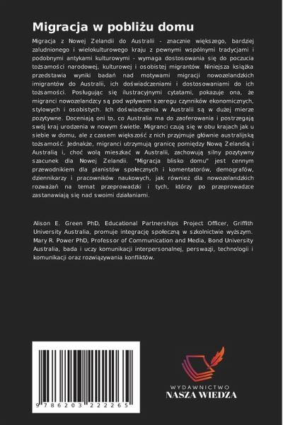 Migracja z Nowej Zelandii do Australii - znacznie wi¿kszego, bardziej zaludnionego i wielokulturowego kraju z pewnymi wspólnymi tradycjami i podobnymi antykami kulturowymi - wymaga dostosowania si¿ do poczucia to¿samo¿ci narodowej, kulturowej i osobistej migrantów. Niniejsza ksi¿¿ka przedstawia wyniki badä nad motywami migracji nowozelandzkich imigrantów do Australii, ich do¿wiadczeniami i dostosowaniami do ich to¿samo¿ci. Pos¿uguj¿c si¿ ilustracyjnymi cytatami, pokazuje ona, ¿e migranci nowozelandzcy s¿ pod wp¿ywem szeregu czynników ekonomicznych, stylowych i osobistych. Ich do¿wiadczenia w Australii s¿ w du¿ej mierze pozytywne. Doceniaj¿ oni to, co Australia ma do zaoferowania i postrzegaj¿ swój kraj urodzenia w nowym ¿wietle. Migranci czuj¿ si¿ w obu krajach jak u siebie w domu, ale z czasem wi¿kszo¿¿ z nich przyjmuje g¿ównie australijsk¿ to¿samo¿¿. Jednak¿e, migranci utrzymuj¿ granic¿ pomi¿dzy Now¿ Zelandi¿ i Australi¿ i, cho¿ wol¿ mieszkä w Australii, zachowuj¿ silny pozytywny szacunek dla Nowej Zelandii. "Migracja blisko domu" jest cennym przewodnikiem dla planistów spo¿ecznych i komentatorów, demografów, dziennikarzy i pracowników naukowych, jak równie¿ dla nowozelandzkich rozwää na temat przeprowadzki i tych, którzy po przeprowadzce zastanawiaj¿ si¿ nad swoimi dziäaniami.