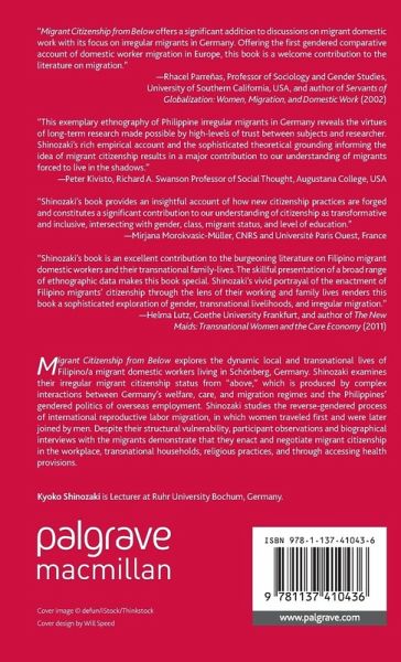 "This exemplary ethnography of Philippine irregular migrants in Germany reveals the virtues of long-term research made possible by high levels of trust between subjects and researcher. Shinozaki's rich empirical account and the sophisticated theoretical grounding informing the idea of migrant citizenship results in a major contribution to our understanding of migrants forced to live in the shadows. Without downplaying the difficulties of their lives, she shows these workers to be agents of their own lives." - Peter Kivisto, Richard A. Swanson Professor of Social Thought, Augustana College, USA