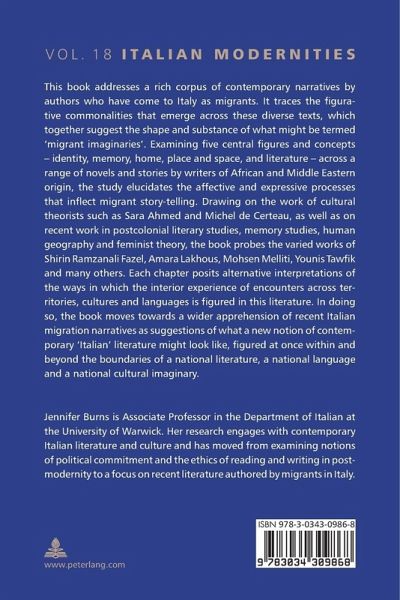 This book addresses a rich corpus of contemporary narratives by authors who have come to Italy as migrants. It traces the figurative commonalities that emerge across these diverse texts, which together suggest the shape and substance of what might be termed 'migrant imaginaries'. Examining five central figures and concepts - identity, memory, home, place and space, and literature - across a range of novels and stories by writers of African and Middle Eastern origin, the study elucidates the affective and expressive processes that inflect migrant story-telling. Drawing on the work of cultural theorists such as Sara Ahmed and Michel de Certeau, as well as on recent work in postcolonial literary studies, memory studies, human geography and feminist theory, the book probes the varied works of Shirin Ramzanali Fazel, Amara Lakhous, Mohsen Melliti, Younis Tawfik and many others. Each chapter posits alternative interpretations of the ways in which the interior experience of encounters across territories, cultures and languages is figured in this literature. In doing so, the book moves towards a wider apprehension of recent Italian migration narratives as suggestions of what a new notion of contemporary 'Italian' literature might look like, figured at once within and beyond the boundaries of a national literature, a national language and a national cultural imaginary.