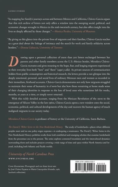 Drawing upon a personal collection of more than 300 letters exchanged between her parents and other family members across the U.S.-Mexico border, Miroslava Chávez-García recreates and gives meaning to the hope, fear, and longing migrants experienced in their everyday lives both “here” and “there” (aqui y alla). As private sources of communication hidden from public consumption and historical research, the letters provide a rare glimpse into the deeply emotional, personal, and social lives of ordinary Mexican men and women as recorded in their immediate, firsthand accounts. Chávez-García demonstrates not only how migrants struggled to maintain their sense of humanity in el norte but also how those remaining at home made sense of their changing identities in response to the loss of loved ones who sometimes left for weeks, months, or years at a time, or simply never returned. With this richly detailed account, ranging from the Mexican Revolution of the 1910s to the emergence of Silicon Valley in the late 1960s, Chávez-García opens a new window onto the social, economic, political, and cultural developments of the day and recovers the human agency of much maligned migrants in our society today.