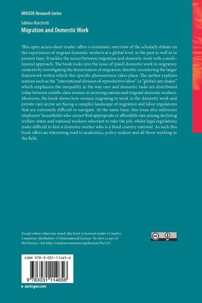 This open access short reader offers a systematic overview of the scholarly debate on the experiences of migrant domestic workers at a global level, in the past as well as in present time. It tackles the nexus between migration and domestic work with a multi-layered approach. The book looks into the issue of (paid) domestic work in migratory contexts by investigating the feminization of migration, thereby considering the larger framework within which this specific phenomenon takes place. The author explains notions such as the "international division of reproductive labor" or "global care chains" which emphasize the inequality in the way care and domestic tasks are distributed today between middle-class women in receiving nations and migrant domestic workers. Moreover, the book shows how women migrating to work in the domestic work and private care sector are facing a complex landscape of migration and labor regulations that are extremely difficult to navigate. At the same time, this issue also addresses employers' households who cannot find appropriate or affordable care among declining welfare states and national workers reluctant to take the job, whilst legal regulations make difficult to hire a domestic worker who is a third country national. As such this book offers an interesting read to academics, policy makers and all those working in the field.