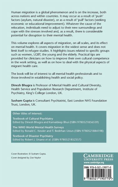 Foreword Mario Maj; Preface; 1. Types of migration: setting the scene Dinesh Bhugra, Susham Gupta and Pedro Ruiz; 2. Epidemiological aspects of migration and mental illness James Kirkbride and Peter Jones; 3. Migration and mental illness: an epidemiological perspective I-Chao Liu and Andrew Cheng; 4. Globalisation, migration and mental disorders Dinesh Bhugra and Susham Gupta; 5. Pre-migration and mental health of refugees Thomas Stompe, David Holzer and Alexander Friedmann; 6. Ethnicity, migration and mental health: the role of social and economic inequalities James Nazroo and Karen Iley; 7. Risk and protective factors in migrants Driss Moussaoui and Mohamed Agoub; 8. Migration and its impact on the psychopathology of psychoses Thomas Stompe and David Holzer; 9. Identity and migration Kam Bhui; 10. Cultural bereavement Dinesh Bhugra, Wojteck Wojcik and Susham Gupta; 11. Collective trauma Daya Somasundaram; 12. The impact of acculturative stress on the mental health of migrants Pedro Ruiz, Carol Maggi and Anna Yusim; 13. Migration and mental health of older people Ajit Shah; 14. Migration and its effects on child mental health Nisha Dogra, Khalid Karim and Pablo Ronzoni; 15. Mental health issues related to migration in women Prabha Chandra; 16. Adapting mental health services to the needs of migrants and ethnic minorities J. D. Ingleby; 17. Refugee and asylum seekers Tom Craig; 18. Reconstructing Hermes: the messenger gets a voice Adil Qureshi, Hilda Wara-Revollo, Francisco Collazos, Jannat el Harrak, Cristina Visiers, María del Mar Ramos and Miguel Casas; 19. Migrants and mental health: working across culture and language Rachel Tribe; 20. Managing relationships and psychotherapy Stephen Turner and Dinesh Bhugra; 21. Harmacotherapy/medical management Norman Poole and Dinesh Bhugra; 22. Mental health of migrants in China - is it a No Man's Land? Roger Ng; 23. Migrant and refugee mental health in Canada: lessons and prospects Laura Simich and Morton Beiser; 24. Conclusions Dinesh Bhugra and Susham Gupta; Index.