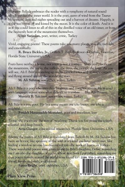 Migration Ballads embraces the reader with a symphony of natural sound which purifies the inner world. It is the poet, gusts of wind from the Taurus Mountains, days and nights spreading out and a harvest of dreams. Happily, it is the sea bitten off and kissed by the moon. It is the color of death. And it is as if you could listen to all of this in the distilled voice of an old timer, or from the heavenly host of the mountains themselves. Umit Sariaslan, poet, writer, critic, Turkey Vivid, engaging poems! These poems take you many places, visually, tactilely, and emotionally. R. Bruce Bickley, Jr., Griffith T. Pugh Professor of English, Emeritus, Florida State University, USA Poets have neither a home, nor a town, nor a country. Their real places are the mountains, the rocks, the valleys, the trees, the swings, the kites. As you will see, Ali F. Bilir is standing up on his tasseled kites and/or magic carpets and flying around among the wondering stars. M. Ali Sulutas, researcher, writer, Turkey Ali F. Bilir is a poet who uses clear language and complex syntax. He is good with language, a poet somewhat difficult to translate. . . like Apollinaire. Mustafa B. Yalciner, researcher, writer, Turkey Ali Bilir is a true poet. His last name means one who knows; one who is insightful... Farideh Hasanzadeh-Mostafavi, poet and translator, Iran To me, the poems are the way of breathing. Thank you for giving me a fresh, colorful, and deep breath. Arzu Gungor, educational researcher, Florida State University, USA Editing the poetry of Ali Bilir as translated from Turkish by M. Ali Sulutas has been an honor, like speaking to the soul of a friend you have never met, like finding a window no one has discovered into the work of Lorca, or Vallejo. These wonderful poems were given to me by Bilir's daughter, Defne, reminding me I am also the daughter of a poet whose first book I published, reminding me that poetry travels around the world from friend to friend, family to family, soul to soul. Susan Bright, poet, publisher, USA