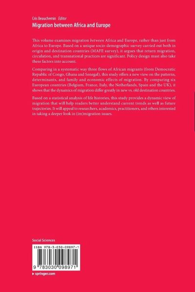 Forward: Douglas S. Massey.- 1: Preface and Introduction: Cris Beauchemin.- 2: Migration between Africa and Europe (MAFE): Advantages and Limitations of a Multi-Site Survey Design: Cris Beauchemin.- 3: African Migration: Diversity and Changes: Bruno Schoumaker et all.- 4: Migration between Africa and Europe: Assessing the role of resources, family and networks. A comparative approach: Amparo González-Ferrer et all.- 5: Understanding Afro-European Economic Integration between Origin and Destination Countries: Eleonora Castagnone.- 6: Migrant Families between Africa and Europe: Comparing Ghanaian, Congolese and Senegalese Migration Flows: Valentina Mazzucato et all.- 7: Congolese Migration In Times Of Political And Economic Crisis: Bruno Schoumaker et all.- 8: Congolese Migrants' Economic Trajectories In Europe And After Return: Bruno Schoumaker et all.- 9: Migration and Family Life between Congo and Europe: Cris Beauchemin et all.- 10: Changing Patterns of Ghanaian Migration: Djamila Schans et all.- 11: Ghanaian migration: economic participation: Richard Black et all.- 12: Transnational families between Ghana, the Netherlands and the UK: Kim Caarls et all.- 13: From Senegal and Back (1975-2008): Trends and Routes of Migrants in Times of Restrictions: Cris Beauchemin et all.- 14: Migrants' economic participation in origin and destination countries: the case of Senegal: Eleonora Castagnone et all.- 15: Senegalese Families Between Here And There: Cris Beauchemin et all.