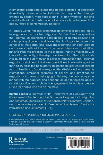 International borders have become deadly barriers of a proportion rivaled only by war or natural disaster. Yet despite the damage created by borders, most people can't - or don't want to - imagine a world without them. What alternatives do we have to prevent the deadly results of contemporary borders? In today's world, national citizenship determines a person's ability to migrate across borders. Migration Borders Freedom questions that premise. Recognizing the magnitude of deaths occurring at contemporary borders worldwide, the book problematizes the concept of the border and develops arguments for open borders and a world without borders. It explores alternative possibilities, ranging from the practical to the utopian, that link migration with ideas of community, citizenship, and belonging. The author calls into question the conventional political imagination that assumes migration and citizenship to be responsibilities of nation states, rather than cities. While the book draws on the theoretical work of thinkers such as Ernst Bloch, David Harvey, and Henry Lefebvre, it also presents international empirical examples of policies and practices on migration and claims of belonging. In this way, the book equips the reader with the practical and conceptual tools for political action, activist practice, and scholarly engagement to achieve greater justice for people who are on the move.