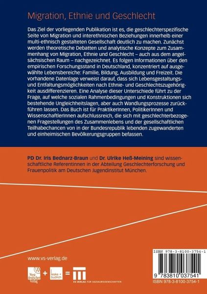 Das Ziel der vorliegenden Publikation ist es, die geschlechterspezifische Seite von Migration und interethnischen Beziehungen innerhalb einer multi-ethnisch gestalteten Gesellschaft deutlich zu machen. Zunächst werden theoretische Debatten und analytische Konzepte zum Zusammenhang von Migration, Ethnie und Geschlecht - auch aus dem angelsächsischen Raum - nachgezeichet. Es folgen Informationen über den empirischen Forschungsstand in Deutschland, konzentriert auf ausgewählte Lebensbereiche: Familie, Bildung, Ausbildung und Freizeit. Die vorhandene Datenlage verweist darauf, dass sich Lebensgestaltungs- und Entfaltungsmöglichkeiten nach Ethnie- und Geschlechtszugehörigkeit ausdifferenzieren. Eine Analyse dieser Unterschiede führt zu der Frage, auf welche sozialen Rahmenbedingungen und Konstruktionen sich bestehende Ungleichheitslagen, aber auch Wandlungsprozesse zurückführen lassen. Das Buch ist für PraktikerInnen, PolitikerInnen und WissenschaftlerInnen aufschlussreich, die sich mit geschlechterbezogenen Fragestellungen des Zusammenlebens und der gesellschaftlichen Teilhabechancen von in der Bundesrepublik lebenden zugewanderten und einheimischen Bevölkerungsgruppen befassen.