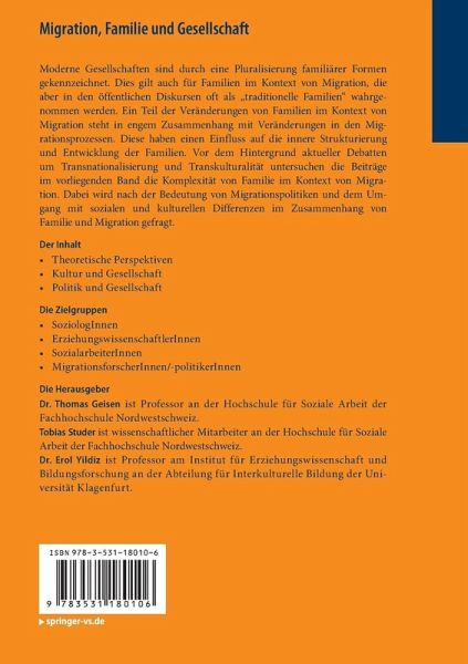Moderne Gesellschaften sind durch eine Pluralisierung familiärer Formen und Muster gekennzeichnet. Dies gilt auch für Familien im Kontext von Migration, die aber in den öffentlichen Diskursen meist immer noch als "traditionelle Familien" wahrgenommen werden. Ein Teil der Veränderungen von Familien im Kontext von Migration steht in engem Zusammenhang mit Veränderungen in den Migrationsprozessen selbst. Diese haben einen Einfluss auf die innere Strukturierung und die Entwicklung der Familien. Vor dem Hintergrund aktueller Debatten um Transnationalisierung und Transkulturalität untersuchen die Beiträge im vorliegenden Band die Komplexität von Familie im Kontext von Migration. Dabei wird nach der Bedeutung von Migrationspolitiken und dem Umgang mit sozialen und kulturellen Differenzen im Zusammenhang von Familie und Migration gefragt.