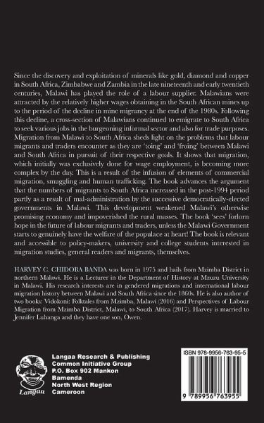 Since the discovery and exploitation of minerals like gold, diamond and copper in South Africa, Zimbabwe and Zambia in the late nineteenth and early twentieth centuries, Malawi has played the role of a labour supplier. Malawians were attracted by the relatively higher wages obtaining in the South African mines up to the period of the decline in mine migrancy at the end of the 1980s. Following this decline, a cross-section of Malawians continued to emigrate to South Africa to seek various jobs in the burgeoning informal sector and also for trade purposes. Migration from Malawi to South Africa sheds light on the problems that labour migrants and traders encounter as they are 'toing' and 'froing' between Malawi and South Africa in pursuit of their respective goals. It shows that migration, which initially was exclusively done for wage employment, is becoming more complex by the day. This is a result of the infusion of elements of commercial migration, smuggling and human trafficking. The book advances the argument that the numbers of migrants to South Africa increased in the post-1994 period partly as a result of mal-administration by the successive democratically-elected governments in Malawi. This development weakened Malawi's otherwise promising economy and impoverished the rural masses. The book 'sees' forlorn hope in the future of labour migrants and traders, unless the Malawi Government starts to genuinely have the welfare of the populace at heart! The book is relevant and accessible to policy-makers, university and college students interested in migration studies, general readers and migrants, themselves