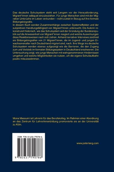 In diesem Buch werden Zusammenhänge zwischen Systemeffekten und der subjektiven Handlungsfähigkeit von Migrant_innen untersucht. Die Autorin rekonstruiert historisch, wie das Schulsystem seit der Gründung der Bundesrepublik auf die Anwesenheit von Migrant_innen reagiert und welche Auswirkungen diese Reaktionsweisen nach sich ziehen. Anhand narrativer Interviews zeichnet sie Bildungsbiografien von 21 Migrant_innen, die im Jugend- und jungen Erwachsenenalter nach Deutschland migriert sind, nach. Ihre Wege ins deutsche Schulsystem werden ebenso aufgezeigt wie die Barrieren, die den Zugang zum und Verbleib im formalen Bildungssystem in Deutschland erschweren. Die Untersuchung zeigt, wie junge Menschen mit wahrgenommenen Hindernissen umgehenund welche Möglichkeiten sie nutzen, um die eigene Schullaufbahn positiv mitzubestimmen.