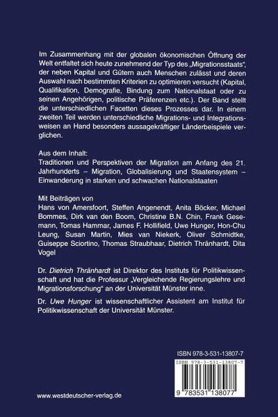 Im Zusammenhang mit der globalen ökonomischen Öffnung der Welt entfaltet sich heute zunehmend der Typ des "Migrationsstaats", der neben Kapital und Gütern auch Menschen zulässt und deren Auswahl nach bestimmten Kriterien zu optimieren versucht (Kapital, Qualifikation, Demografie, Bindung zum Nationalstaat oder zu seinen Angehörigen, politische Präferenzen etc.). Der Band stellt die unterschiedlichen Facetten dieses Prozesses dar. In einem zweiten Teil werden unterschiedliche Migrations- und Integrationsweisen an Hand besonders aussagekräftiger Länderbeispiele verglichen.