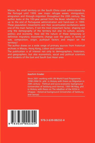 Macau, the small territory on the South China coast administered by the Portugal until 1999, saw major refugee waves, immigration, emigration and through-migration throughout the 20th century. The author looks at the 100-year period from the Boxerrebellion in 1900 up to the end of Portuguese administration andhand-over in 1999. These population movements and their accentuated oscillations were one of the main factors, if not the mostimportant factor, shaping not only the demography of the territorybut also its culture, society, politics and economy. How did the nature of these temporary or definitive migratory movements change over the years, in terms of size, composition, origin, push/pull factors and impact on the territory? The author draws on a widerange of primary sources from historical archives in Macau, HongKong, Lisbon and London. The publication is of interest not only to demographers, historians, and geographers, but also economists, social and political scientists andstudents of the East and SouthEast Asian area.