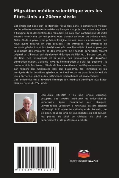 Cet article est basé sur les données recueillies dans le dictionnaire médical de l'Académie nationale de médecine française auprès des auteurs qui sont à l'origine de la description des maladies. La collection contient plus de 2500 auteurs américains qui ont publié leurs travaux au cours du 20ème siècle. Notre étude a permis de préciser l'origine de ces auteurs américains que nous avons répartis en trois groupes : les immigrés, les immigrés de seconde génération et les Américains nés aux Etats-Unis. Il est apparu que la majorité des immigrés et des immigrés de seconde génération étaient originaires d'Europe, principalement d'Europe de l'Est et d'Europe centrale. Un tiers des immigrants et la moitié des immigrants de deuxième génération étaient d'origine juive et l'immigration a suivi les pogroms, le nazisme et le fascisme. L'étude de leurs carrières scientifiques montre que, par rapport aux Américains nés aux États-Unis, les immigrés et les immigrés de la deuxième génération ont été reconnus pour la notoriété de leurs carrières, grâce à des distinctions scientifiques et académiques. Cet antisémitisme a favorisé l'immigration médico-scientifique aux États-Unis au cours du 20e siècle.
