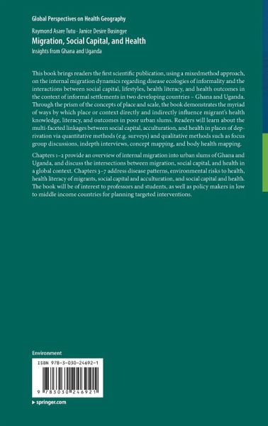 This book brings readers the first scientific publication, using a mixed-method approach, on the internal migration dynamics regarding disease ecologies of informality and the interactions between social capital, lifestyles, health literacy, and health outcomes in the context of informal settlements in two developing countries - Ghana and Uganda. Through the prism of the concepts of place and scale, the book demonstrates the myriad of ways by which place or context directly and indirectly influence migrant's health knowledge, literacy, and outcomes in poor urban slums. Readers will learn about the multi-faceted linkages between social capital, acculturation, and health in places of deprivation via quantitative methods (e.g. surveys) and qualitative methods such as focus group discussions, in-depth interviews, concept mapping, and body health mapping. Chapters 1-2 provide an overview of internal migration into urban slums of Ghana and Uganda, and discuss the intersections between migration, social capital, and health in a global context. Chapters 3-7 address disease patterns, environmental risks to health, health literacy of migrants, social capital and acculturation, and social capital and health. The book will be of interest to professors and students, as well as policy makers in low to middle income countries for planning targeted interventions.