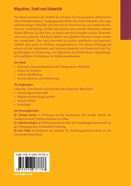 Der Band analysiert die Vielfalt des urbanen Zusammenlebens differenziert und mehrdimensional. Ausgangspunkt bildet die soziale Tatsache, dass migrationsbedingte Mobilität seit jeher für die Entwicklung von Städten konstitutiv ist. Verdichtung, Vielfalt und Wandel sind zentrale Merkmale urbaner (Sozial-)Räume. Es sind Orte, an denen sich die kulturelle, soziale, ökonomische und politische Dynamik lokaler und globaler Prozesse immer wieder neu vermischen. Dies wird einerseits als positiv empfunden und gewertet, vielfach aber auch als Problem wahrgenommen. Vor diesem Hintergrund setzen sich die Autorinnen und Autoren empirisch und theoretisch mit Fragestellungen zur Bedeutung von Migration und Wirkweisen migrationsgesellschaftlicher Verhältnisse in Städten auseinander.