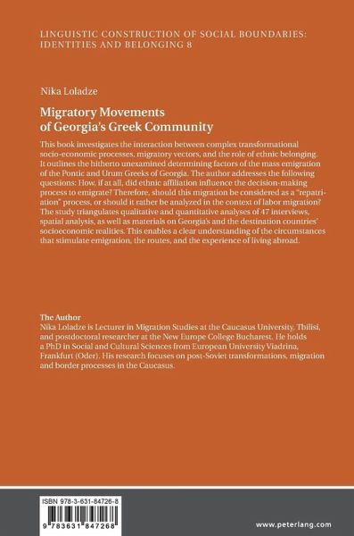 This book investigates the interaction between complex transformational socio-economic processes, migratory vectors, and the role of ethnic belonging. It outlines the hitherto unexamined determining factors of the mass emigration of the Pontic and Urum Greeks of Georgia. The author addresses the following questions: How, if at all, did ethnic affiliation influence the decision-making process to emigrate? Therefore, should this migration be considered as a "repatriation" process, or should it rather be analyzed in the context of labor migration? The study triangulates qualitative and quantitative analyses of 47 interviews, spatial analysis, as well as materials on Georgia's and the destination countries' socioeconomic realities. This enables a clear understanding of the circumstances that stimulate emigration, the routes, and the experience of living abroad.