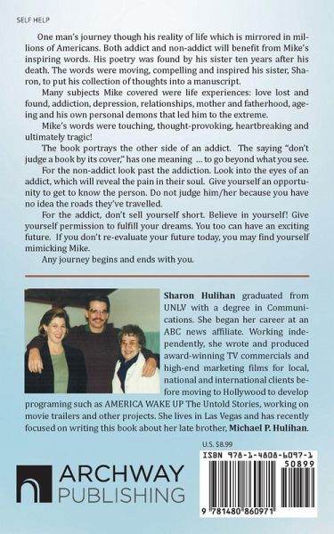 One man's journey though his reality of life which is mirrored in millions of Americans. Both addict and non-addict will benefit from Mike's inspiring words. His poetry was found by his sister ten years after his death. The words were moving, compelling and inspired his sister, Sharon, to put his collection of thoughts into a manuscript. Many subjects Mike covered were life experiences: love lost and found, addiction, depression, relationships, mother and fatherhood, ageing and his own personal demons that led him to the extreme. Mike's words were touching, thought-provoking, heartbreaking and ultimately tragic! The book portrays the other side of an addict. The saying "don't judge a book by its cover," has one meaning ... to go beyond what you see. For the non-addict look past the addiction. Look into the eyes of an addict, which will reveal the pain in their soul. Give yourself an opportunity to get to know the person. Do not judge him/her because you have no idea the roads they've travelled. For the addict, don't sell yourself short. Believe in yourself! Give yourself permission to fulfill your dreams. You too can have an exciting future. If you don't re-evaluate your future today, you may find yourself mimicking Mike. Any journey begins and ends with you.
