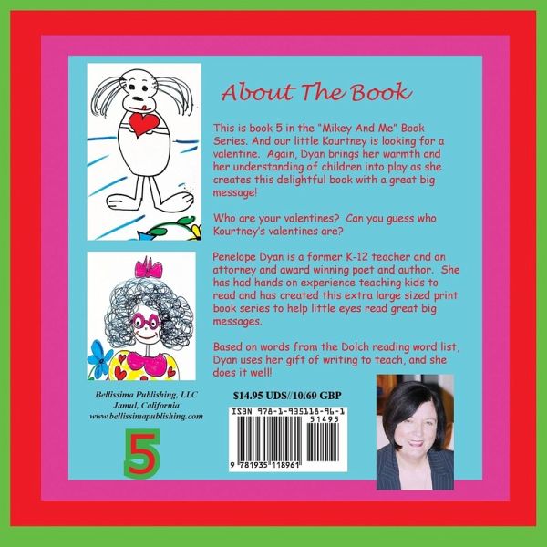 This book was written on Valentines Day and is book five in the 'Mikey And Me' book series. It incorporates the words from the dolch reading word list to add yet another very special dimension to the book. But it doesn't have to be Valentines Day for a kid to enjoy "Mikey And Me And The Valentines," and it doesn't have to be Valentines Day to remind us that we need to remind one another every single day that we love them. The message of 'who is your valentine' every day of the year is quite clear in this kid sized, friendly early reader book with the extra large sized print, created especially for little eyes that need extra help seeing so that they can enjoy reading. Kid friendly, fun and kid tested, Penelope Dyan makes her message clear. Love is everywhere! You just need to know where to look for it. Dyan is a former K-12 teacher, an attorney and an award winning author, illustrator and poet, who proves once again that Bellisssima loves kids! Just ask any child who happens to be a Penelope Dyan fan, and they will tell you the very same thing, because books are also meant for kids!