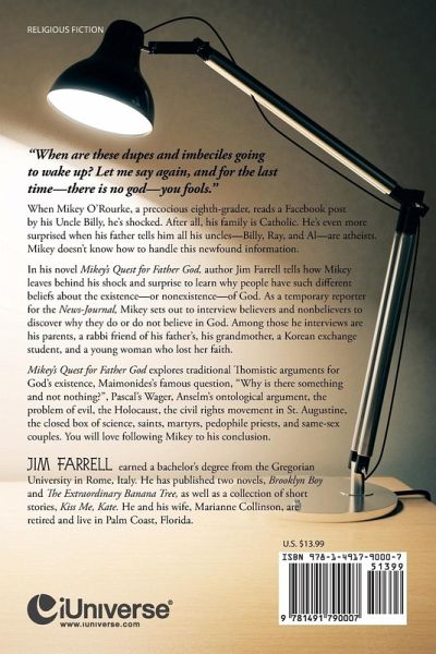 "When are these dupes and imbeciles going to wake up? Let me say again, and for the last time-there is no god-you fools." When Mikey O'Rourke, a precocious eighth-grader, reads a Facebook post by his Uncle Billy, he's shocked. After all, his family is Catholic. He's even more surprised when his father tells him all his uncles-Billy, Ray, and Al-are atheists. Mikey doesn't know how to handle this newfound information. In his novel Mikey's Quest for Father God, author Jim Farrell tells how Mikey leaves behind his shock and surprise to learn why people have such different beliefs about the existence-or nonexistence-of God. As a temporary reporter for the News-Journal, Mikey sets out to interview believers and nonbelievers to discover why they do or do not believe in God. Among those he interviews are his parents, a rabbi friend of his father's, his grandmother, a Korean exchange student, and a young woman who lost her faith. Mikey's Quest for Father God explores traditional Thomistic arguments for God's existence, Maimonides's famous question, "Why is there something and not nothing?", Pascal's Wager, Anselm's ontological argument, the problem of evil, the Holocaust, the civil rights movement in St. Augustine, the closed box of science, saints, martyrs, pedophile priests, and same-sex couples. You will love following Mikey to his conclusion.