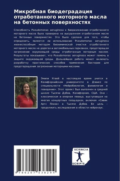 Sposobnost' Pseudomonas aeruginosa k biorazlozheniü otrabotannogo motornogo masla byla prowerena na wysushennom otrabotannom masle na betonnyh powerhnostqh. Jeto bylo sdelano dlq togo, chtoby opredelit', qwlqetsq li ispol'zowanie Pseudomonas aeruginosa zhiznesposobnym metodom biohimicheskoj ochistki otrabotannogo motornogo masla na dorogah i awtomobil'nyh parkowkah, predotwraschaq zagrqznenie okruzhaüschej sredy otrabotannym motornym maslom. Rezul'taty pokazywaüt, chto Pseudomonas aeruginosa mozhet pomoch' w zaschite okruzhaüschej sredy. Dal'nejshaq rabota mozhet wklüchat' razrabotku prakticheskih sposobow primeneniq bakterii dlq predotwrascheniq zagrqzneniq motornymi maslami.