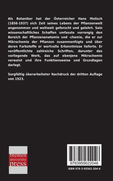 Als Botaniker hat der Österreicher Hans Molisch (1856-1937) sich Zeit seines Lebens der Pflanzenwelt angenommen und weltweit geforscht und gelehrt. Sein wissenschaftliches Schaffen umfasste vorrangig den Bereich der Pflanzenanatomie und -chemie, die er zur Mikrochemie der Pflanzen zusammenfügte und über deren Farbstoffe er wertvolle Erkenntnisse lieferte. Er veröffentlichte zahlreiche Schriften, darunter das vorliegende Werk, das auf ebenjene Mikrochemie verweist und ihre Funktionsweise und Grundlagen darlegt.
