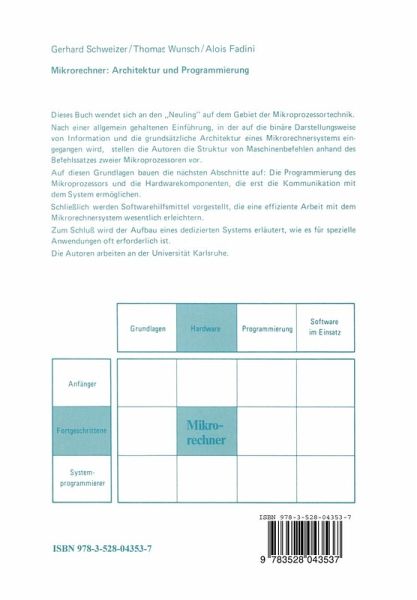 Dieses Buch wendet sich an den "Neuling" auf dem Gebiet der Mikroprozessortechnik. Nach einer allgemein gehaltenen Einfiihrung, in der auf die binare Darstellungsweise von Information und die grundsatzliche Architektur eines Mikrorechnersystems eingegangen wird, stellen wir die Struktur von Maschinenbefehlen anhand des Befehlssatzes zweier M ikroprozessoren vor. Auf diesen Grundlagen bauen die nachsten Abschnitte auf: Die Programmierung des Mikroprozessors und die Hardwarekomponenten, die erst die Kommunikation mit dem System ermoglichen. SchlieBlich stellen wir Softwarehilfsmittel vor, die eine effiziente Arbeit mit dem Mikro rechnersystem wesentlich erleichtern. Zum SchluB gehen wir auf den Aufbau eines dedizierten Systems ein, wie es fiir spezielle Anwendungen oft erforderlich ist. Um den Praxisbezug herzustellen, haben wir versucht, moglichst anhand von Beispielen zu arbeiten und hoffen, zu einem allgemeinen Verstandnis fiir den Aufbau eines Mikro prozessorsystems und den Umgang damit beizutragen. VII Inhaltsverzeichnis v Vorwort Einleitung . . . . . . . . . . . . . . . . . . . . . . . . . . . . . . . . . . . . . VI . . . . . . . . . . . 1 Die Von-Neumann-Maschine . . . . . . . . . . . . . . . . . . . . . . . . . . . . . . 1. 1 Der Speicher . . . . . . . . . . . . . . . . . . . . . . . . . . . . . . . . . . . . . . . . 2 1. 2 Das Rechenwerk . . . . . . . . . . . . . . . . . . . . . . . . . . . . . . . . . . . . . . 3 1. 3 Steuereinheit und Systembus . . . . . . . . . . . . . . . . . . . . . . . . . . . . . 4 1. 4 Ein-/Ausgabe. . . . . . . . . . . . . . . . . . . . . . . . . . . . . . . . . . . . . . . . 4 2 Der Speicher: Interpretationen von Speicherinhalten, Operationen mit Speicherinhalten . . . . . . . . . . . . . . . . . . . . . . . . . . 5 2. 1 Zahlen. . . . . . . . . . . . . . . . . . . . . . . . . . . . . . . . . . . . . . . . . . . . 5 2. 1. 1 Dezimalsystem. . . . . . . . . . . . . . . . . . . . . . . . . . . . . . . . . . 5 2. 1. 2 Dualsystem. . . . . . . . . . . . . . . . . . . . . . . . . . . . . . . . . . . . 6 2. 1. 3 Hexadezimalsystem. . . . . . . . . . . . . . . . . . . . . . . . . . . . . . . 6 2. 1. 4 BCD-System . . . . . . . . . . . . . . . . . . . . . . . . . . . . . . . . . . . 7 2. 1. 5 Konvertierung Dezimal in Dual und Umkehrung . . . . . . . . . . . . 8 2. 1. 6 Konvertierung Dual/Dezimal fiber Hexadezimalzahlen . . . . . . . . 11 2. 2 Operationen mit Zahlen . . . . . . . . . . . . . . . . . . . . . . . . . . . . . . . . . 13 2. 2. 1 B inare arithmetische Operationen . . . . . . . . . . . . . . . . . . . . . 13 a) Add ition . . . . . . . . . . . . . . . . . . . . . . . . . . . . . . . . . . . . 13 b) Subtraktion . . . . . . . . . . . . . . . . . . . . . . . . . . . . . . . . . . 13 c) Verschiebung . . . . . . . . . . . . . . . . . . . . . . . . . . . . . . . . . 16 d) Multiplikation . . . . . . . . . . . . . . . . . . . . . . . . . . . . . . . . 16 e) Division . . . . . . . . . . . . . . . . . . . . . . .. . . . . . . . . . . . . 17 f) BCD-Addition . . . . . . . . . . . . . . . . . . . . . . . . . . . . . . . .