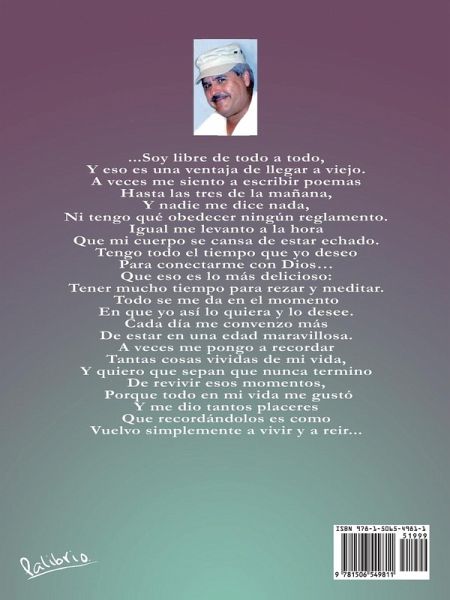 ...Soy libre de todo a toddo, Y eso es una ventaja de llegar a viejo. A veces me siento a escribir poemas Hasta las tres de mañana, Y nadie me dice nada, Ni tengo qué obedecer ningún reglamento. Igual me levanto a la hora Que mi cuerpo se cansa de estar echado. Tengo todo el tiempo que yo deseo Para conectarme con Dios... Que eso es lo mas delicioso: Tener mucho tiempo para rezar y meditar. Todo se me da en el momento En que yo así lo quiera y lo desee. Cada día me convenzo más De estar en una edad maravillosa. A veces me pongo a recordar Tantas cosas vividas de mi vida, Y quiero que sepan que nunca ternimo De revivir esos momentos, Porque todo en mi vida me gustó Y me dio tantos placeres Que recordándolos es como Vuelvo simplemente a vivir y a reir...