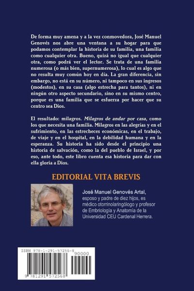 En este libro tan ameno, José Manuel Genovés nos abre una ventana a su hogar, para que podamos contemplar la historia de su familia, una familia como cualquier otra. Bueno, quizá no igual que cualquier otra, como podrá ver el lector. Se trata de una familia numerosa (o más bien, supernumerosa), algo que no resulta muy común hoy en día. La gran diferencia, sin embargo, no está en su número, ni tampoco en sus ingresos (modestos), en su casa (algo estrecha para tantos), ni en ningún otro aspecto secundario, sino en su mismo centro, porque es una familia que se esfuerza por hacer que su centro sea Dios. El resultado: milagros. Milagros de andar por casa, como los que necesita una familia. Milagros en las alegrías y en el sufrimiento, en las estrecheces económicas, en el trabajo, de viaje y en el hospital, en la debilidad humana y en la esperanza. Su historia ha sido desde el principio una historia de salvación, como la del pueblo de Israel, y este libro cuenta esa historia para dar con ella gloria a Dios.