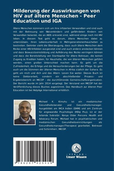 Ältere Menschen kümmern sich um ihre infizierten Verwandten und sind auch mit der Betreuung von Waisenkindern und gefährdeten Kindern von Verwandten belastet, die an AIDS erkrankt sind, während einige noch mit HIV leben. In diesem Text geht es darum, ältere Menschen dabei zu unterstützen, ihren Lebensunterhalt in Mehrgenerationenhaushalten zu bestreiten. Dahinter steht die Überzeugung, dass auch ältere Menschen dem Risiko einer HIV-Infektion ausgesetzt sind und auch andere anstecken können und dass Bewusstseinsbildung und Aufklärung das Risiko verringern können und dass die Bereitstellung von Startkapital für ältere Betreuer, die keinen Zugang zu Krediten haben, für Haushalte, die von älteren Menschen geführt werden, einen großen Unterschied machen kann. Es geht um die Zufriedenheit, die Erfolge und die Herausforderungen bei der Pflege. Es geht auch um die Stimmen der älteren Menschen in Afrika südlich der Sahara. Es geht um mich und dich und das Altern. Lesen Sie weiter. Dieses Buch ist keine Doktorarbeit, sondern ein abschließender Prozess- und Ergebnisbericht an MICOP - die durchführende Gemeinschaftsorganisation. Der Bericht wurde im Jahr 2014 vorgelegt. Der Vorstand von MICOP hat der Veröffentlichung dieses Buches zugestimmt. Das Handbuch zur älteren Peer Education ist bei HelpAge International erhältlich.