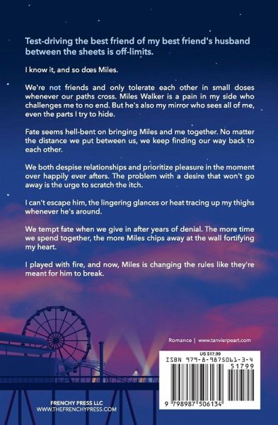 Test-driving the best friend of my best friend's husband between the sheets is off-limits. I know it, and so does Miles. We're not friends and only tolerate each other in small doses whenever our paths cross. Miles Walker is a pain in my side who challenges me to no end. But he's also my mirror who sees all of me, even the parts I try to hide. Fate seems hell-bent on bringing Miles and me together. No matter the distance we put between us, we keep finding our way back to each other. We both despise relationships and prioritize pleasure in the moment over happily ever afters. The problem with a desire that won't go away is the urge to scratch the itch. I can't escape him, the lingering glances or heat tracing up my thighs whenever he's around. We tempt fate when we give in after years of denial. The more time we spend together, the more Miles chips away at the wall fortifying my heart. I played with fire, and now, Miles is changing the rules like they're meant for him to break. Miles Apart is a frienemies-to-lovers story about two people who swear off relationships and get caught up in a thing called love. This spicy book is perfect for romance readers who enjoy tension, banter, and love finding a way. Tropes include:Cinnamon roll hero with 50 Cent audacity Not here for your BS FMC In denial Fake dating Sworn off relationships Forced proximity Twin flame energy Very heated scenes