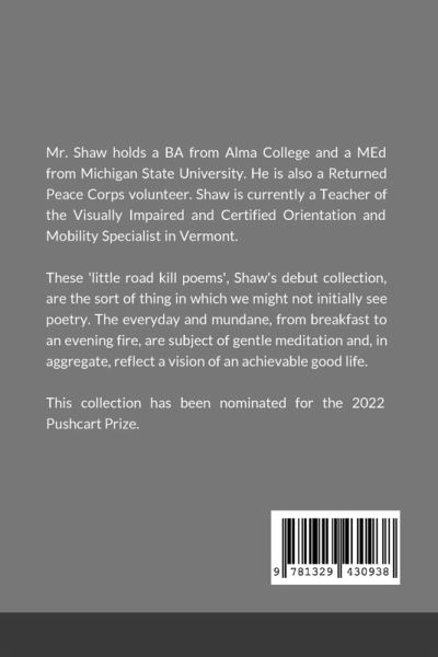 These 'little road kill poems', the debut collection from E. Landon Shaw, are the sort of thing in which we might not initially see poetry. The everyday and mundane, from breakfast to an evening fire, are subject of gentle meditation and, in aggregate, reflect a vision of an achievable good life. This collection has been nominated for the 2022 Pushcart Prize.