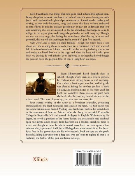 Love. Heartbreak. Two things that have gone hand in hand throughout time. Being a hopeless romantic has drawn me to both over the years, leaving me with just a pen in my hand and a piece of paper to write on. Sometimes that makes good writing, as seen with the poems, songs and stories that have we have embraced as part of lives. In this day and age, people may or may not understand that love isn't something that we are required to do, but something that happens to us. It will get in the way of plans and change the paths that we walk every day. Though we may not want to go, this feeling that some have called fleeting, is so real and powerful, that we will do anything to feel it, even if it's just for a second. Miles From Love is based on these feelings. Though the entire book is not about love, the running theme in each poem is an emotional reach into a world full of confused emotions. A friend once told me that writing is slitting your wrists and letting the blood flow on to the page, and what you have left is what your heart was beating. So with this first book, the blood in my heart has flowed through my pen and onto the pages in front of you, a living heart on paper.
