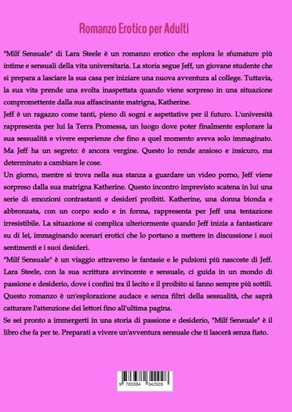 "Milf Sensuale" di Lara Steele è un romanzo erotico che esplora le sfumature più intime e sensuali della vita universitaria. La storia segue Jeff, un giovane studente che si prepara a lasciare la sua casa per iniziare una nuova avventura al college. Tuttavia, la sua vita prende una svolta inaspettata quando viene sorpreso in una situazione compromettente dalla sua affascinante matrigna, Katherine.Jeff è un ragazzo come tanti, pieno di sogni e aspettative per il futuro. L'università rappresenta per lui la Terra Promessa, un luogo dove poter finalmente esplorare la sua sessualità e vivere esperienze che fino a quel momento aveva solo immaginato. Ma Jeff ha un segreto: è ancora vergine. Questo lo rende ansioso e insicuro, ma determinato a cambiare le cose.Un giorno, mentre si trova nella sua stanza a guardare un video porno, Jeff viene sorpreso dalla sua matrigna Katherine. Questo incontro imprevisto scatena in lui una serie di emozioni contrastanti e desideri proibiti. Katherine, una donna bionda e abbronzata, con un corpo sodo e in forma, rappresenta per Jeff una tentazione irresistibile. La situazione si complica ulteriormente quando Jeff inizia a fantasticare su di lei, immaginando scenari erotici che lo portano a mettere in discussione i suoi sentimenti e i suoi desideri."Milf Sensuale" è un viaggio attraverso le fantasie e le pulsioni più nascoste di Jeff. Lara Steele, con la sua scrittura avvincente e sensuale, ci guida in un mondo di passione e desiderio, dove i confini tra il lecito e il proibito si fanno sempre più sottili. Questo romanzo è un'esplorazione audace e senza filtri della sessualità, che saprà catturare l'attenzione dei lettori fino all'ultima pagina.Se sei pronto a immergerti in una storia di passione e desiderio, "Milf Sensuale" è il libro che fa per te. Preparati a vivere un'avventura sensuale che ti lascerà senza fiato.