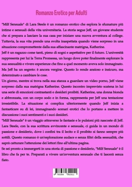 "Milf Sensuale" di Lara Steele è un romanzo erotico che esplora le sfumature più intime e sensuali della vita universitaria. La storia segue Jeff, un giovane studente che si prepara a lasciare la sua casa per iniziare una nuova avventura al college. Tuttavia, la sua vita prende una svolta inaspettata quando viene sorpreso in una situazione compromettente dalla sua affascinante matrigna, Katherine.Jeff è un ragazzo come tanti, pieno di sogni e aspettative per il futuro. L'università rappresenta per lui la Terra Promessa, un luogo dove poter finalmente esplorare la sua sessualità e vivere esperienze che fino a quel momento aveva solo immaginato. Ma Jeff ha un segreto: è ancora vergine. Questo lo rende ansioso e insicuro, ma determinato a cambiare le cose.Un giorno, mentre si trova nella sua stanza a guardare un video porno, Jeff viene sorpreso dalla sua matrigna Katherine. Questo incontro imprevisto scatena in lui una serie di emozioni contrastanti e desideri proibiti. Katherine, una donna bionda e abbronzata, con un corpo sodo e in forma, rappresenta per Jeff una tentazione irresistibile. La situazione si complica ulteriormente quando Jeff inizia a fantasticare su di lei, immaginando scenari erotici che lo portano a mettere in discussione i suoi sentimenti e i suoi desideri."Milf Sensuale" è un viaggio attraverso le fantasie e le pulsioni più nascoste di Jeff. Lara Steele, con la sua scrittura avvincente e sensuale, ci guida in un mondo di passione e desiderio, dove i confini tra il lecito e il proibito si fanno sempre più sottili. Questo romanzo è un'esplorazione audace e senza filtri della sessualità, che saprà catturare l'attenzione dei lettori fino all'ultima pagina.Se sei pronto a immergerti in una storia di passione e desiderio, "Milf Sensuale" è il libro che fa per te. Preparati a vivere un'avventura sensuale che ti lascerà senza fiato.